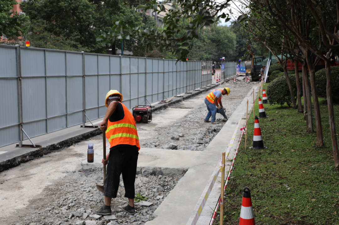 在观景路段施工现场,工人们正热火朝天地施工。正在开展车行道路面市政管线(电力、弱电、自来水、燃气)交集部位探坑人工开挖、混凝土路面切缝、破碎、沟槽开挖、建渣外运弃置、人工捡底、管道及镁阳极安装、沟槽砼包管、车行道拉杆钢筋植筋、传力杆及支架钢筋制安、暗埋接明敷处弯头及双金属管道焊接等工作,下一步计划进行车行道路面面层恢复。预计9月底将完成观景路的补水管线铺设,进一步开展郊区段施工。